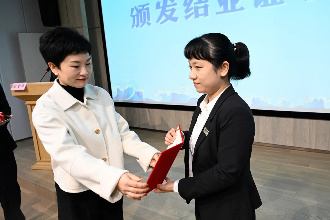 领导为学员们一对一授予结业证书,并赠与“青训一班”纪念章。同时,为本次培训表现突出的三位“优秀学员”颁发了荣誉证书。
