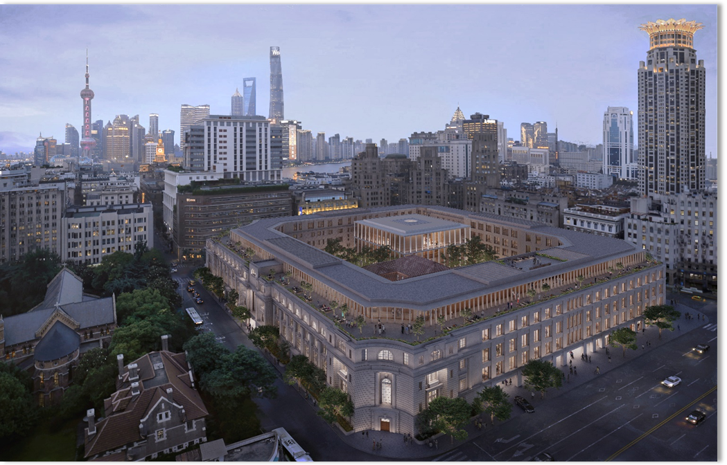 ▲老市府大楼(原工部局大楼)1922年建成后建筑布局图 原来,这幢楼启用时就是一栋未完成建筑。因为按照1912年的建设方案,它应该是个围合形态,但由于种种原因,其启用时只完成了三分之二,而这个半围合形态也伴随着上海这座城市整整持续了一百年。 最终,保护性综合改造设计方案提出:对西南角长期“缺角”的部分进行弥补,改扩建后将形成由老市府大楼、小红楼、环形扩建建筑、庭院建筑、地下室共同组成的街区尺度的围合式建筑综合体,占地约1.52万平方米。