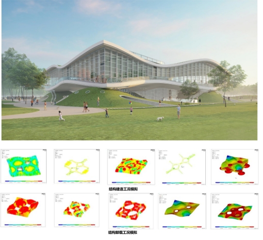 由上海建工集团承建的在水一方新建工程项目位于上海奉贤新城核心区域,是奉贤新城重点公共服务项目。该项目总建筑面积29576.7平方米,结构采用双层双曲面异形预应力空间壳体结构,结构形式复杂,国内外几乎无既往建造案例可循。 该项目于2021年12月10日开工,在施工过程中,确保建造过程受力变形与设计工况相契合,采用了ANSYS软件进行15个工况数值模拟及方案比选,并发明创新产品—万向U型扣,用以解决曲面排架顶托内偏心受力问题,同时自主研发高支模监测系统,可实时监测高支模立杆轴力与倾角变形。项目全过程采用数字建造技术指导现场施工,在预应力张拉、结构卸载过程中全过程数字化监测,为整体结构施工保驾护航。